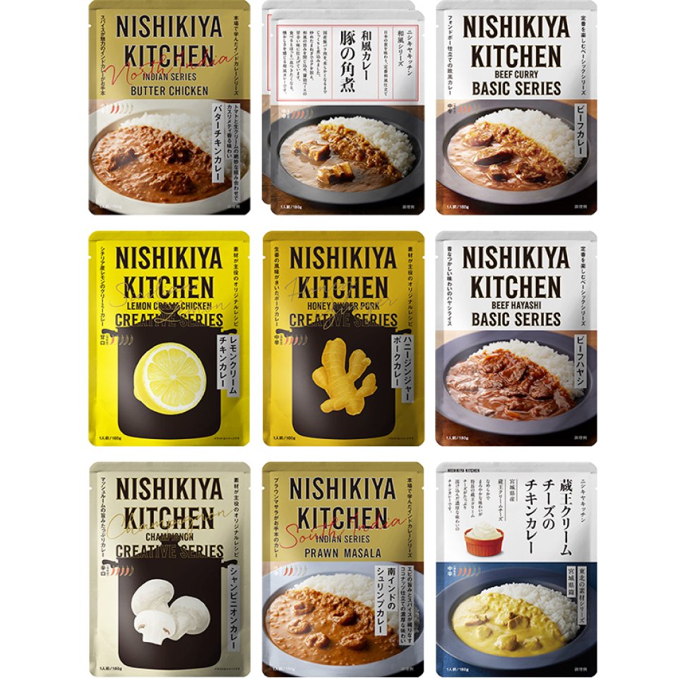 バターチキンカレー(小辛)×1個、豚の角煮カレー(中辛)×2個、ビーフカレー(中辛)×1個、レモンクリームチキンカレー(甘口)×1個、ハニージンジャーポークカレー(中辛)×1個、ビーフハヤシ×1個、シャンピニオンカレー(辛口)×1個、南インドのシュリンプカレー(小辛)×1個、蔵王クリームチーズのチキンカレー(中辛)×1個