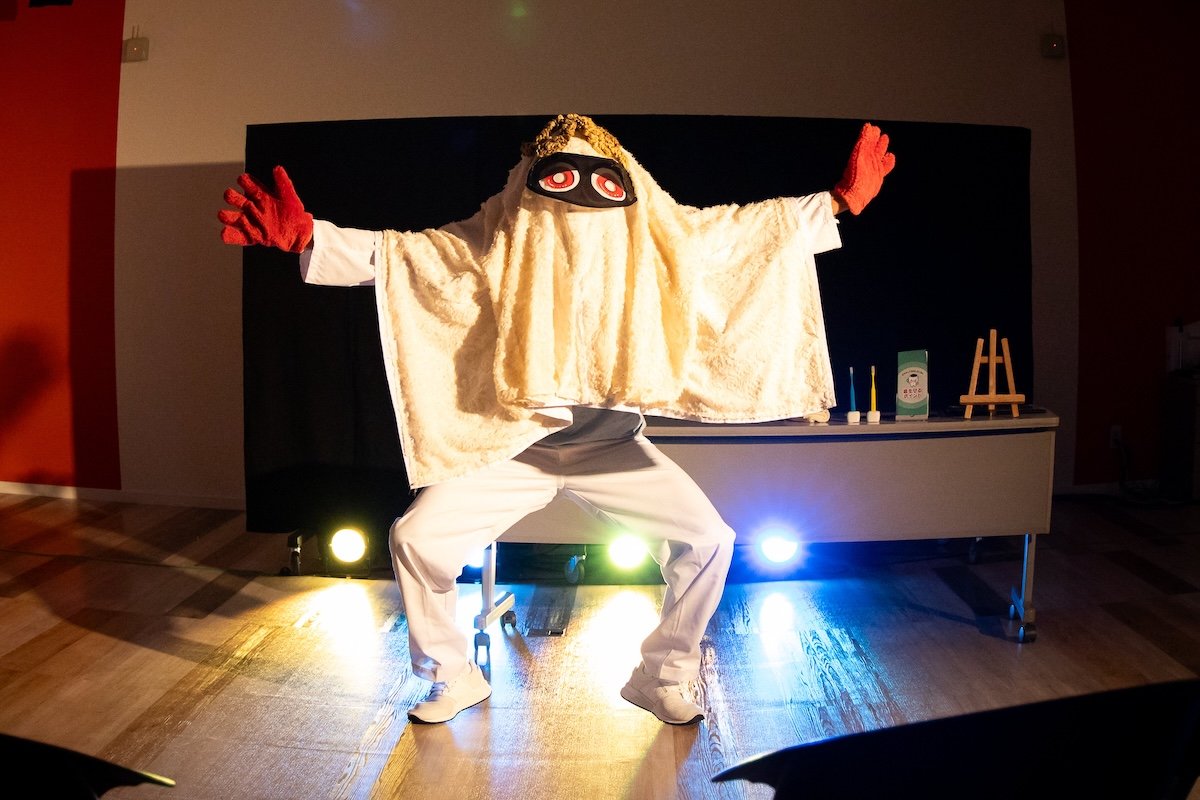 当日は会社の会議室に特設された劇場空間で、まずは社員全員が「おんたろう」を鑑賞。その後、社員みずから「おんたろう」になりきってみるワークや、自分自身の実体験に照らし合わせたアンケートなどを実践しました。演劇という"フィクション"を一度挟むことで、普段なら心の奥に飲み込んでしまう感情も、少しだけ正直に外へ解き放つことができました。